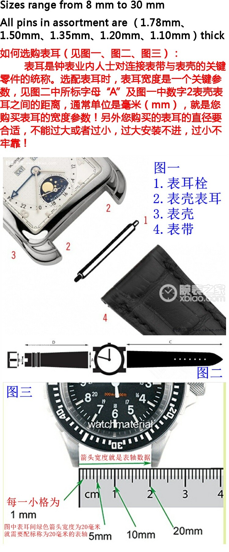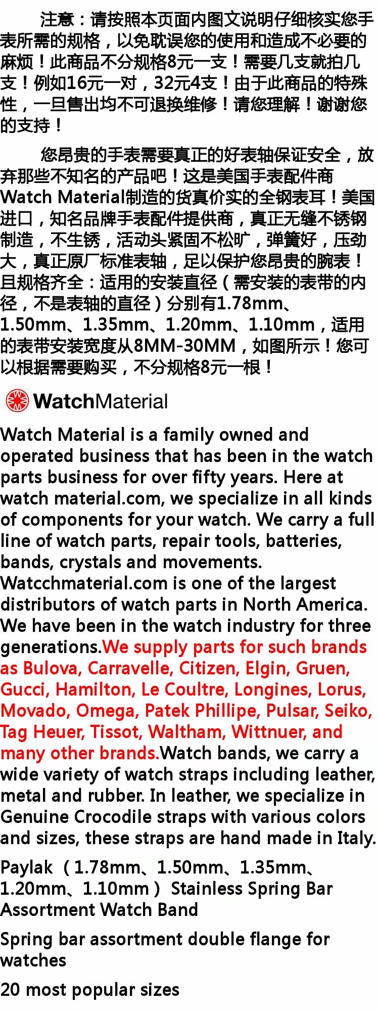 参数信息 品牌 Watch Material 材质 精钢 颜色分类 1.78MM直径 8元一根 拍下尺寸均为适用尺寸非全长尺寸 尺寸 10mm,12mm,13mm,14mm,15mm,16mm,17mm,18mm,19mm,20mm,22mm,28mm,26mm,24mm,21mm,9mm,8mm,11mm 图文详情
