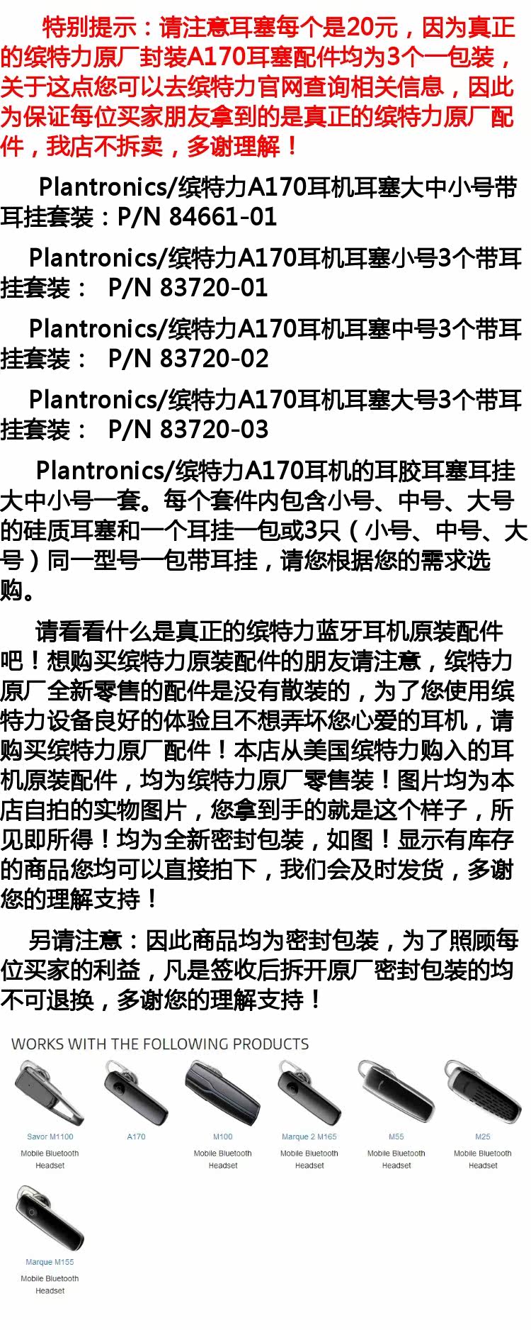 参数信息 品牌 Plantronics/缤特力 型号 A170 材质 硅胶 风格 商务 适用的耳机品牌 其他 颜色分类 缤特力原厂封装中号3个带耳挂,缤特力原厂封装小号3个带耳挂,缤特力原厂封装大号3个带耳挂,缤特力原厂大中小号带耳挂套装 触感 软壳 图文详情