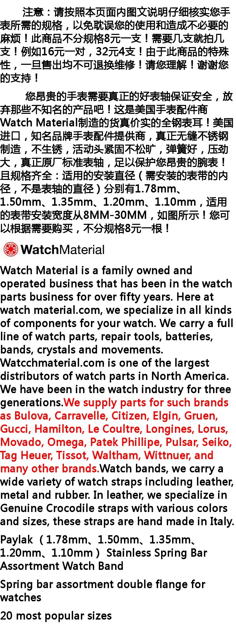参数信息 品牌 Watch Material 材质 精钢 颜色分类 1.35MM直径 8元一根 拍下尺寸均为适用尺寸非全长尺寸 尺寸 10mm,11mm,12mm,13mm,14mm,15mm,16mm,17mm,18mm,19mm,20mm,22mm,21mm 图文详情