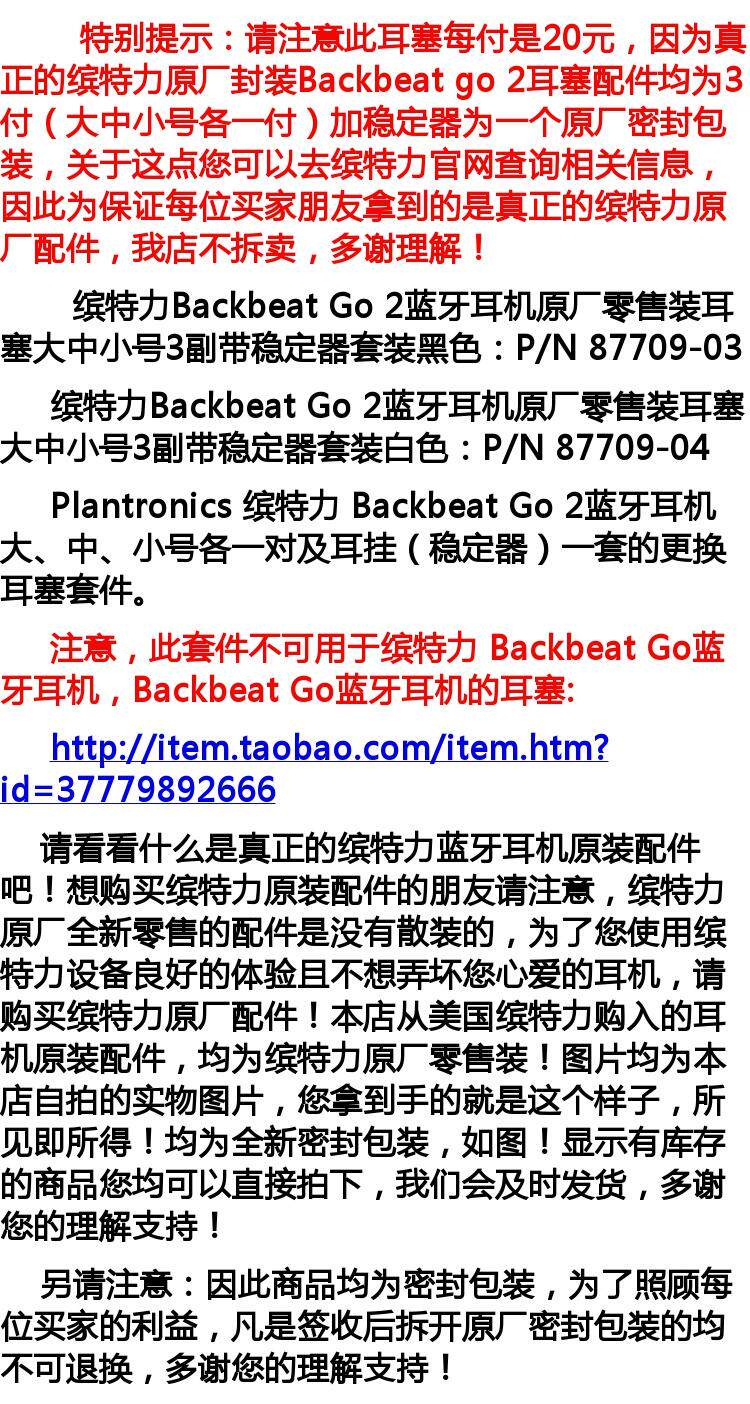 参数信息 品牌 Plantronics/缤特力 型号 Backbeat Go2 材质 硅胶 风格 商务 适用的耳机品牌 其他 颜色分类 大中小号耳胶含稳定器一套黑色,大中小号耳胶含稳定器一套白色 触感 软壳 图文详情