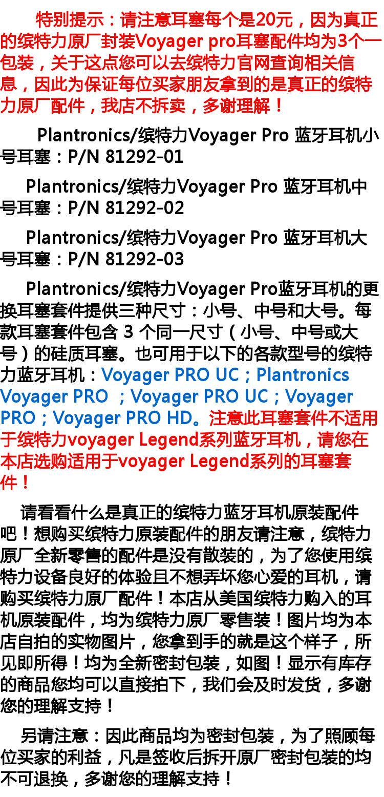 参数信息 品牌 Plantronics/缤特力 型号 Voyager Pro+ UC HD 材质 硅胶 风格 商务 适用的耳机品牌 其他 颜色分类 缤特力原厂封装中号3个一包,缤特力原厂封装小号3个一包,缤特力原厂封装大号3个一包 触感 软壳 图文详情