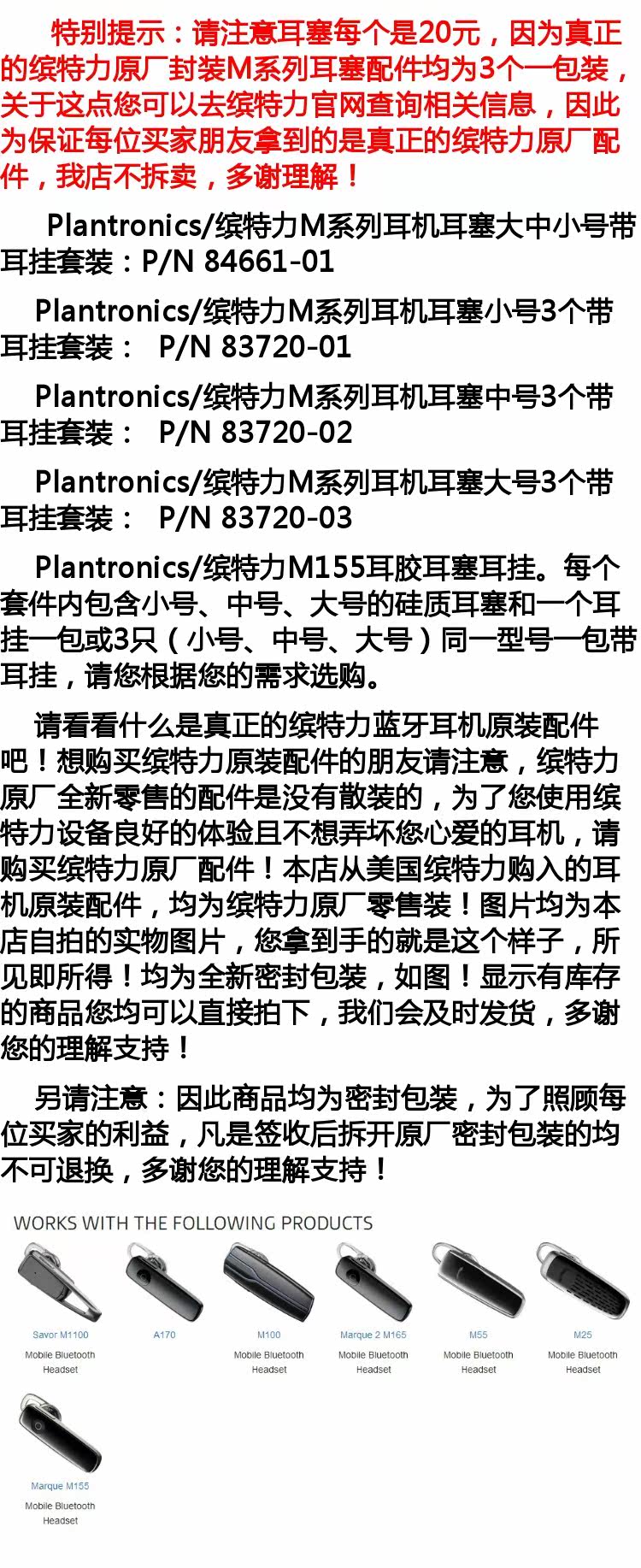参数信息 品牌 Plantronics/缤特力 型号 M155 材质 硅胶 风格 商务 适用的耳机品牌 其他 颜色分类 缤特力原厂大中小号带耳挂套装,缤特力原厂封装小号3个带耳挂,缤特力原厂封装大号3个带耳挂,缤特力原厂封装中号3个带耳挂 触感 软壳 图文详情